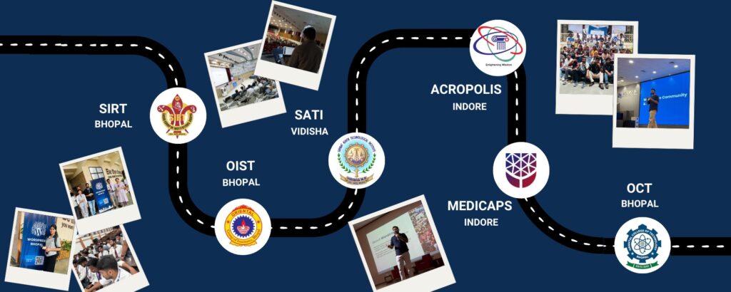 Thanks to their support, we were able to pull this off smoothly. Special shout-outs to: SIRT Student Body (Bhopal), Advance Studies Club- Medicaps Indore, GDG Indore & E-Cell, SATI Vidisha.